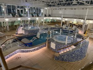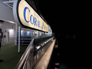 The Coral Princess took her maiden voyage in 2003, making it one of the oldest in the fleet, second only to the Island Princess, which we sailed on in both 2023 and 2025.. She was refurbished in 2019 and refreshed again in 2024 so she feels fairly current.. Coral Princess is small by cruise standards at just 965 feet long and 203 feet high. Her narrow width of just 122 feet (including the bridge wing) also makes her ideal for getting into unique locations such as the original locks of the Panama Canal. She weighs 91,627 tons and sits with a draft of 26 feet. With 1545 guest cabins (1,105 outside and 440 inside) there is room for about 2000 guests. This segment of the Pacific Circle Tour runs from Singapore to Tokyo and lasts for 25 days. It is one of 5 legs along the entire Pacific Circle Tour, The ship is a full cruise at 2000 passengers. That makes for a hungry group of people, which can choose about 12 locations to find food. There are 16 decks in all. Decks 15-7 host a variety of lounges/ bars and entertainment venues. There are specialized areas for quiet relaxation such as the Sanctuary, the Lotus spa, a stocked library and writing room. For more specialized entertainment, cruisers will find a full range of entertainers from stage productions to musicians, comedians and magic acts. There is never a reason for boredom with Movies and Concerts Under the Stars, a cigar/smoking lounge, a casino, a card room, shops, and a Fine Arts Gallery. When work still has to get done, there is an internet center and there are self-service laundry facilities on each cabin deck. For active minded people there is a Sports Deck complete with basketball courts, pickle ball, ping pong and a full service Fitness Center. Classes like Tai Chi, Yoga and Pilates are held in various lounges. To cool off there are 4 pools. To warm up, there are 5 hot tubs. For the unexpected emergencies there is even a full medical facility. The ship carries a crew of 885 to make sure we all have the safest, most satisfying experience while on board. refurbished 2019